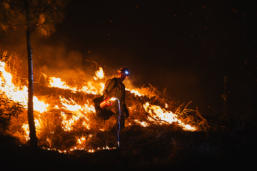 ©Sean Stanley, Wildland Firefighter, A member of the Mill Creek Hotshots monitors a freshly burned section of fire line after a burnout operation. The image was taken at the beginning of a shift that would extend through the night and into the following morning. Federal Hotshot crews represent the highest level of wildland firefighting, specializing in long, grueling assignments that demand precision, endurance, and constant situational awareness. Often mistaken for other agencies, Hotshots are routinely tasked with the most complex and dangerous portions of a fire and play a central role in bringing large incidents under control.