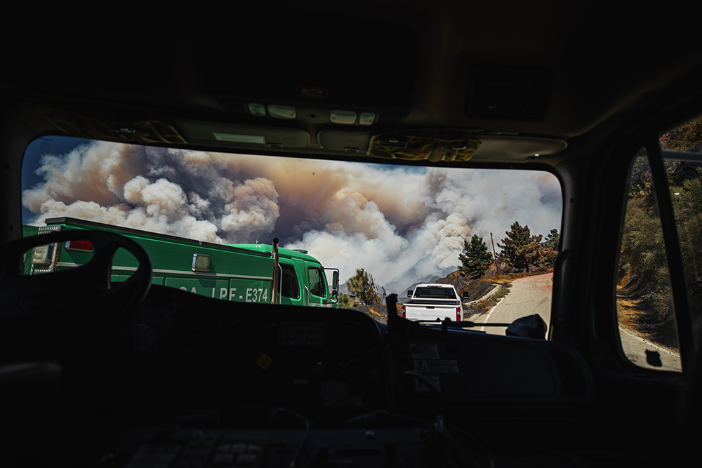 ©Sean Stanley, Bridge Fire– Seen from inside a responding fire engine on the second day of the Bridge Fire, this photograph captures the blaze in September 2024 as it made a massive, wind-driven run. Igniting the day prior, the fire rapidly escalated in size and intensity, burning more than 30,000 acres within a single day. The image reflects the moment crews confronted the scale, speed, and volatility of the incident upon arrival.