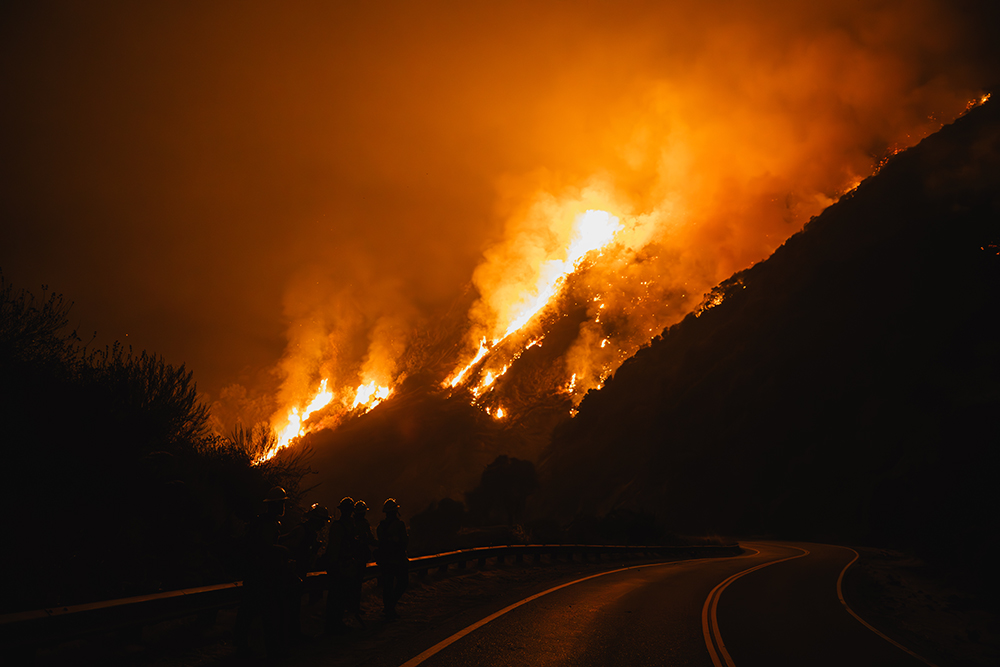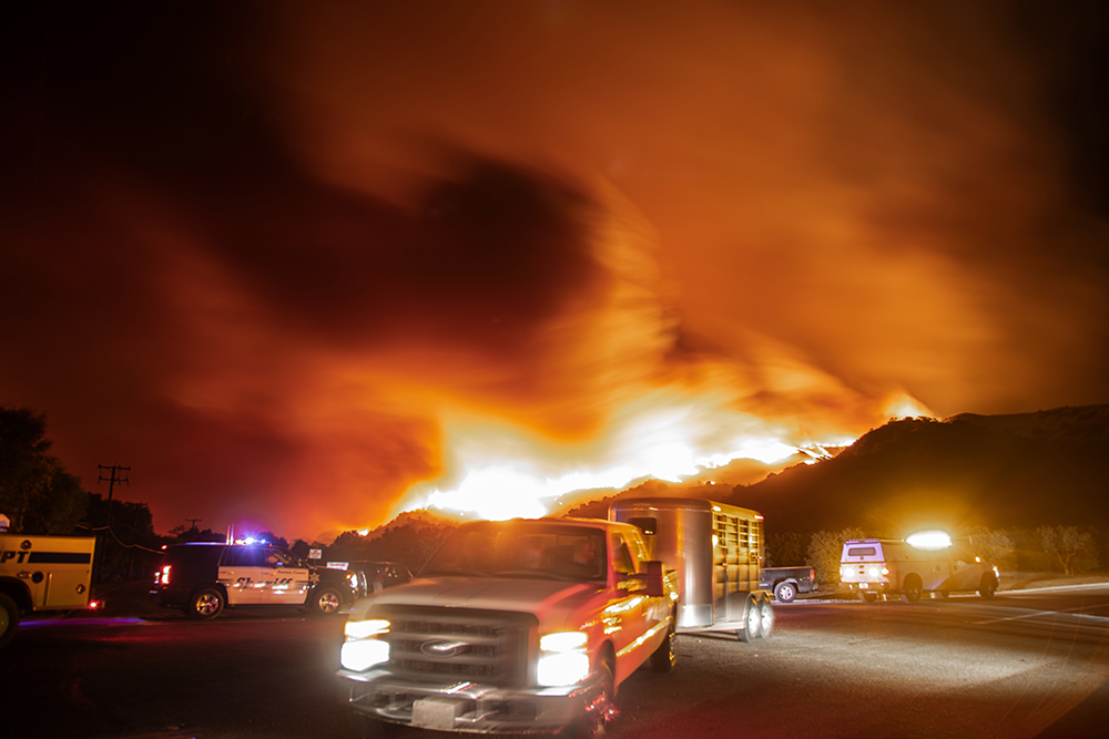 ©Sean Stanley, Chaos, Photographed on December 4, 2017, this image documents the Thomas Fire as extreme Santa Ana winds drove the fire at an alarming rate through Ventura County. Amid rapidly deteriorating conditions, the scene descended into chaos as law enforcement, firefighters, and members of the public scrambled to evacuate residents and move horses and other animals to safety. The photograph reflects the overwhelming sensory intensity of the moment—fire, wind, smoke, and sound converging as the fire surged forward.