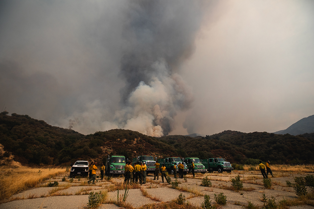 ©Sean Stanley, Feds, U.S. Forest Service Engine crews from 1652 Charlie Strike Team stage on the Bridge Fire, September 2024. Often overlooked or mistaken for Cal Fire or trail workers, the green engines of the Forest Service represent the federal wildland firefighters who make up the backbone of large wildfire suppression. While municipal fire departments play a critical role in structure protection, it is federal and interagency crews who spend days and weeks hiking steep terrain, laying hose, and cutting handline to contain fires across vast landscapes. The image highlights the largely unseen workforce responsible for stopping wildfires at their source.