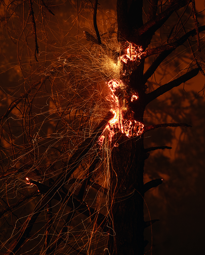 ©Sean Stanley, Fireworks, Photographed on the first night of the French Fire, this long-exposure image isolates a single tree continuing to burn after the fire front had passed. Wind-driven embers streak across the frame, creating a visual effect reminiscent of fireworks, while revealing the persistent heat and residual energy left behind in the wake of a wildfire. The photograph documents the quieter, less visible phase of fire behavior that unfolds after the initial run.
