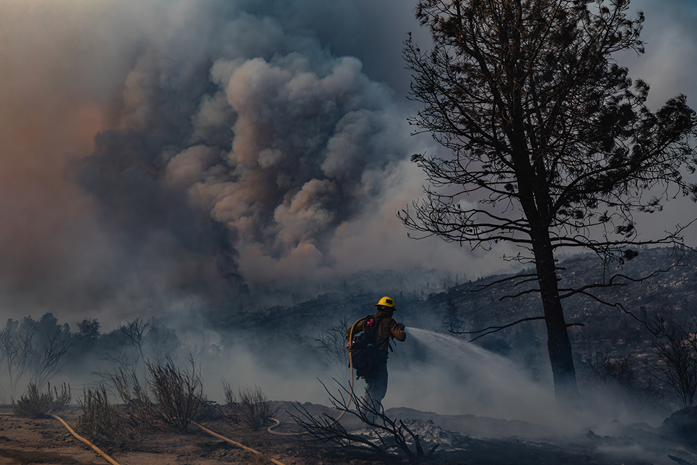 ©Sean Stanley, Hoselay, A federal wildland firefighter works the fire line during the French Fire near Lake Isabella in Kern County, California, August 18, 2021. Often overlooked, federal crews operate in some of the harshest conditions on wildfires—frequently in temperatures exceeding 100°F and during 12–16 hour shifts. Unlike municipal firefighters, wildland crews do not wear respirators, carrying instead packs weighing roughly 45 pounds, often supplemented by hose packs or chainsaws adding another 25–30 pounds. Alongside extreme heat, firefighters contend with heavy smoke exposure, falling snags, rough terrain, limited sleep, dehydration, and repeated aerial water or retardant drops. The image documents the physical and environmental toll inherent to wildland firefighting.