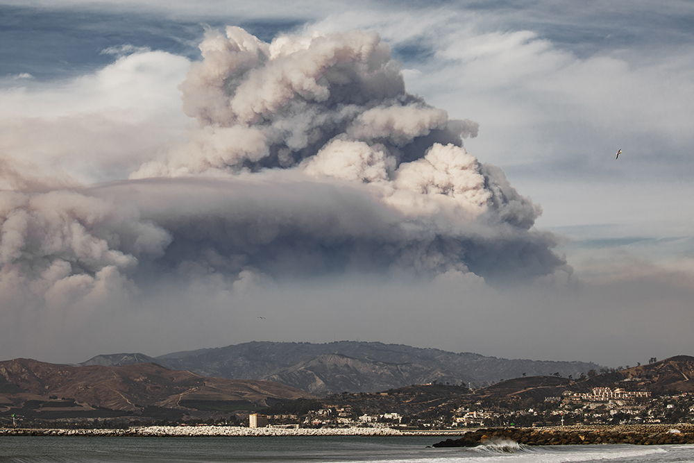 ©Sean Stanley, Thomas Fire, Photographed six days into the Thomas Fire, this image was captured from Ventura Harbor and reveals the immense scale and force of one of California’s most destructive wildfires. Towering smoke columns rise above the coastal landscape, underscoring the magnitude of the fire’s growth and the destruction left in its wake. The photograph places the viewer at a distance, emphasizing how far-reaching and dominant the fire had become across Southern California.