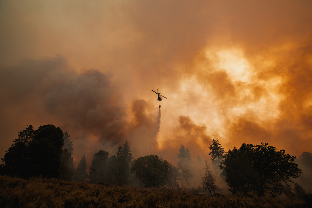 ©Sean Stanley, Waterdrop, A helicopter conducts a water drop on the French fire in support of ground crews during wildfire suppression. Aerial drops play a critical role in cooling hot spots along the fire line, supporting mop-up operations, and slowing fire spread in areas difficult to access on foot. Beyond suppression, helicopters provide essential intelligence from the air, relaying real-time fire behavior that is often obscured from the ground by smoke, terrain, and limited visibility. Frequently overlooked, aerial resources remain a vital and coordinated component of modern wildland firefighting.