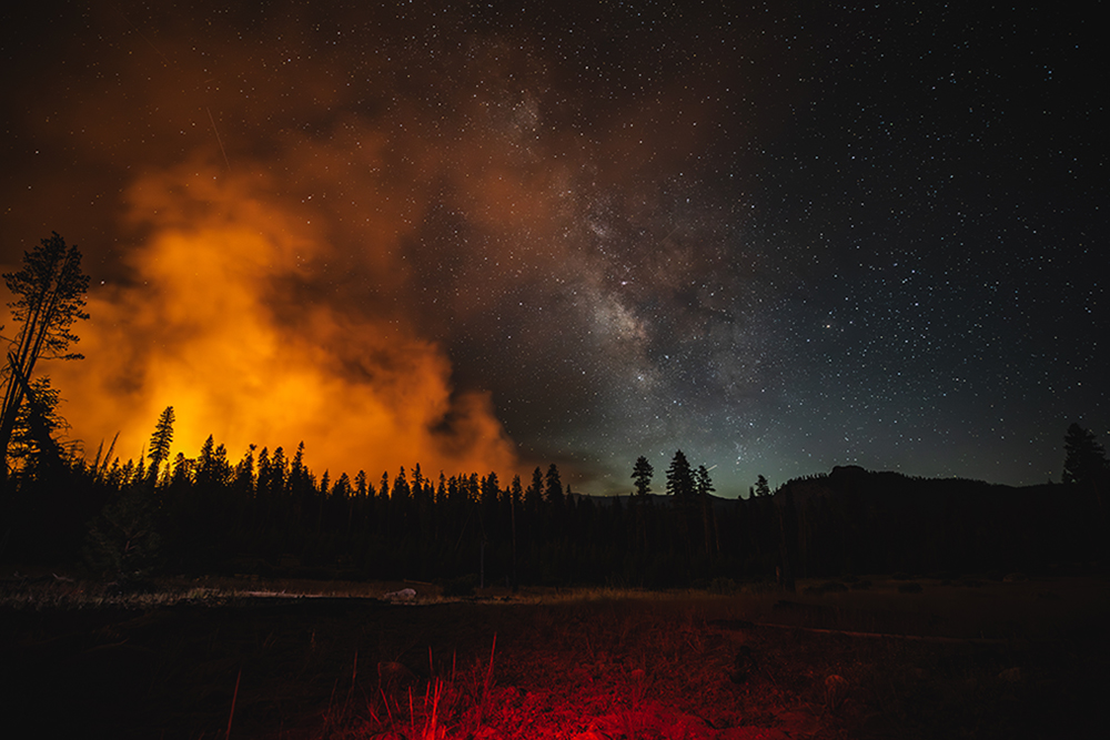 ©Sean Stanley, Yosemite, Photographed during the Red Fire in the remote backcountry of Yosemite National Park, this image captures the Milky Way rising above a lightning-caused wildfire. Due to the fire’s isolation, the responding engine crew was inserted by helicopter and operated as a small hand crew, spiking out and monitoring fire activity in rugged terrain far from roads or infrastructure. After a long day on the line, the photograph was taken moments before sleep, revealing the rare and often unseen intersection of wildfire and wilderness. The image reflects the quiet, extraordinary scenes encountered while working fires in places few people ever experience.