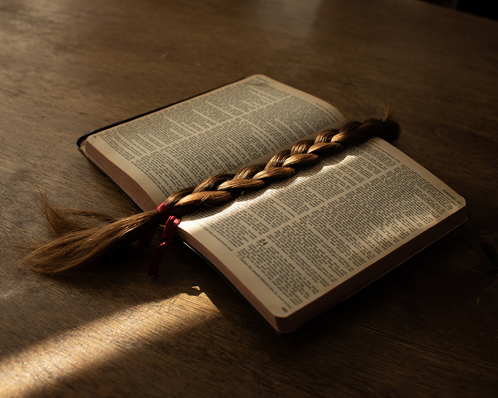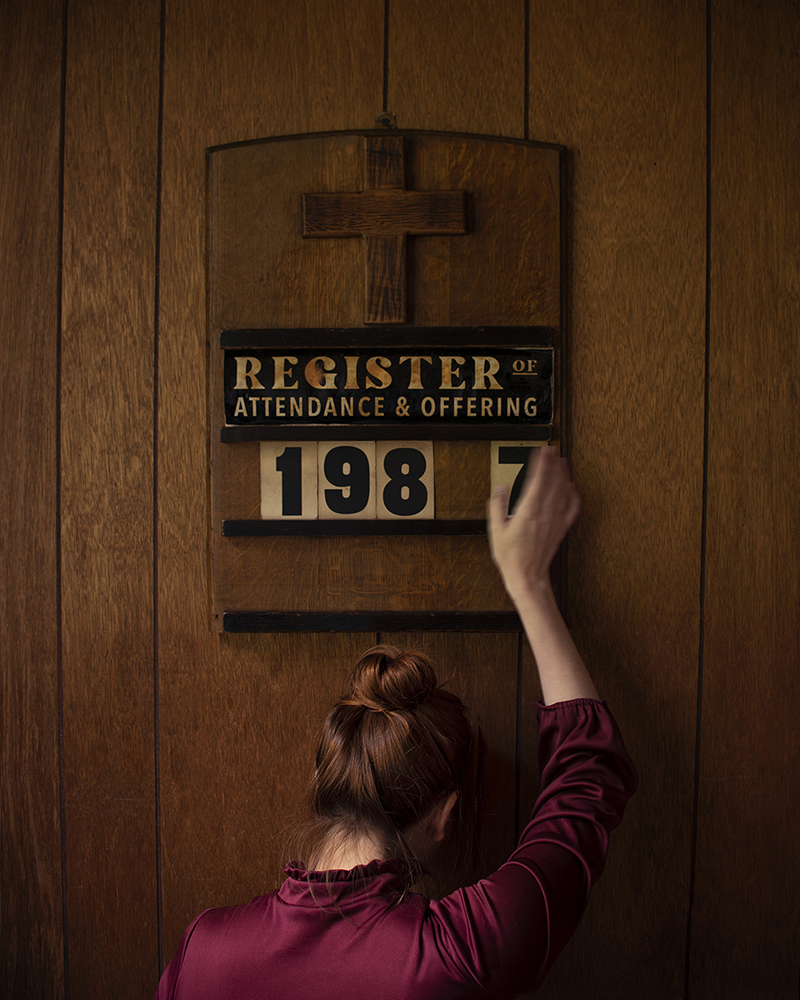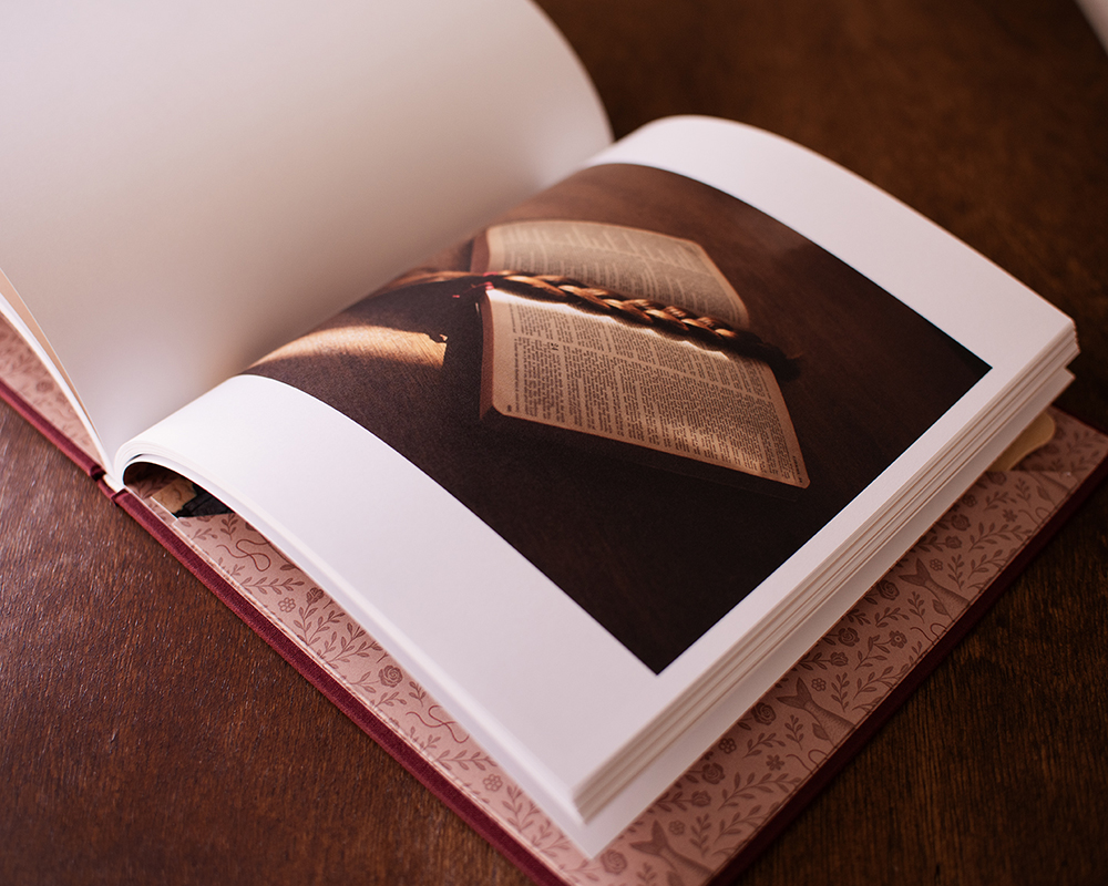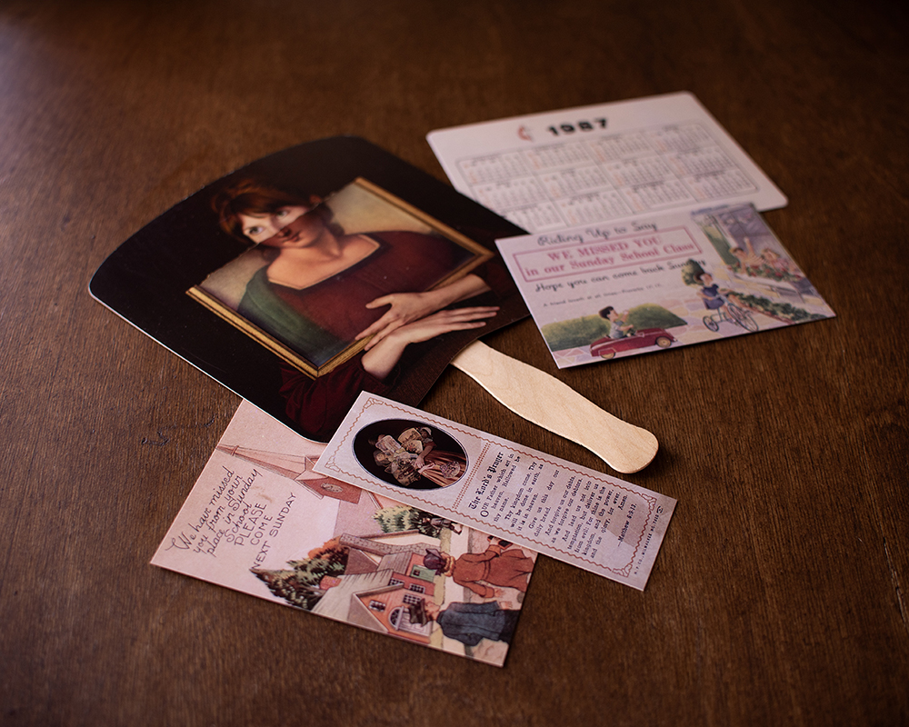 When designing the book for Skipping Sundays, I wanted it to evoke the feeling of a hymnal found tucked away in the back of a church pew. I replicated the burgundy fabric cover and gold foil printing on a hymnal that belonged to my mother-in-law. I sourced vintage illustrations from old Sunday school ephemera, modifying them to fit the themes in the book. My intention was for this book to look like a moment frozen in time. At the back, I included a pocket containing a vintage calendar from 1987 (the year of my confirmation), a bookmark, a church fan, and a reproduction of a “We Missed You” postcard from Sunday School.