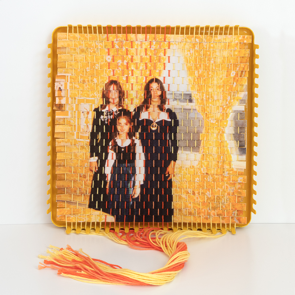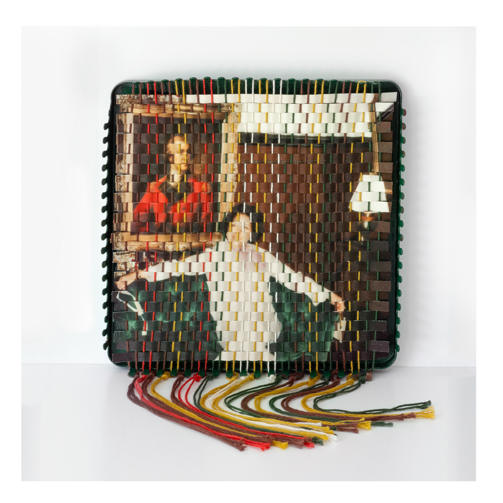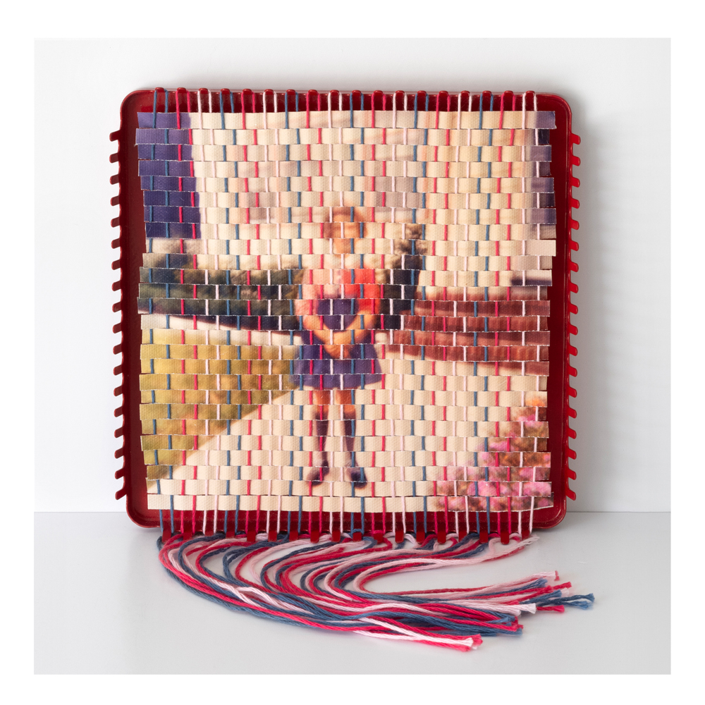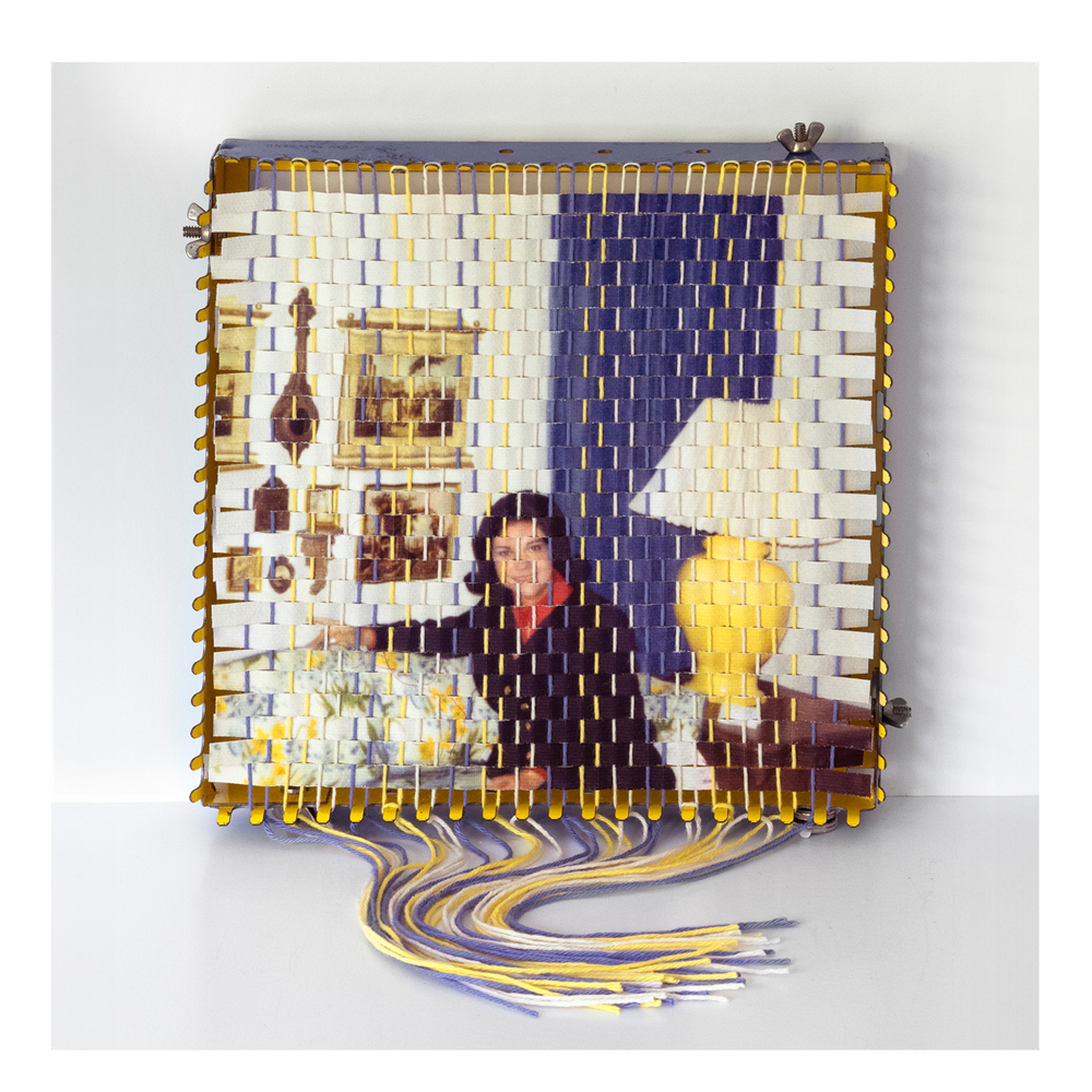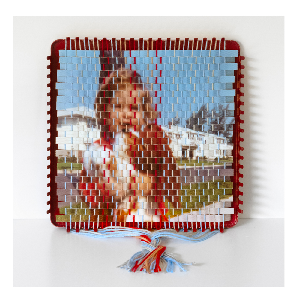 Using her archive of family snapshots, Connolly reprints the photographs digitally on canvas and slices them into strips. Warping the metal loom with colored thread, she then weaves the photographs back together. The finished piece includes both loom and woven image forming a 3-dimensional photo object. In this way, a personal history is both remembered and reconstructed-visibly imperfect and ephemeral.