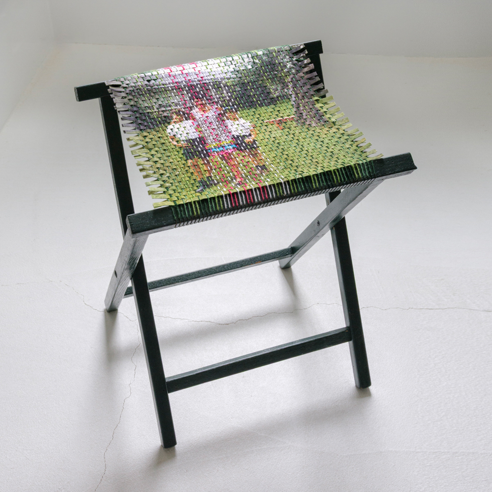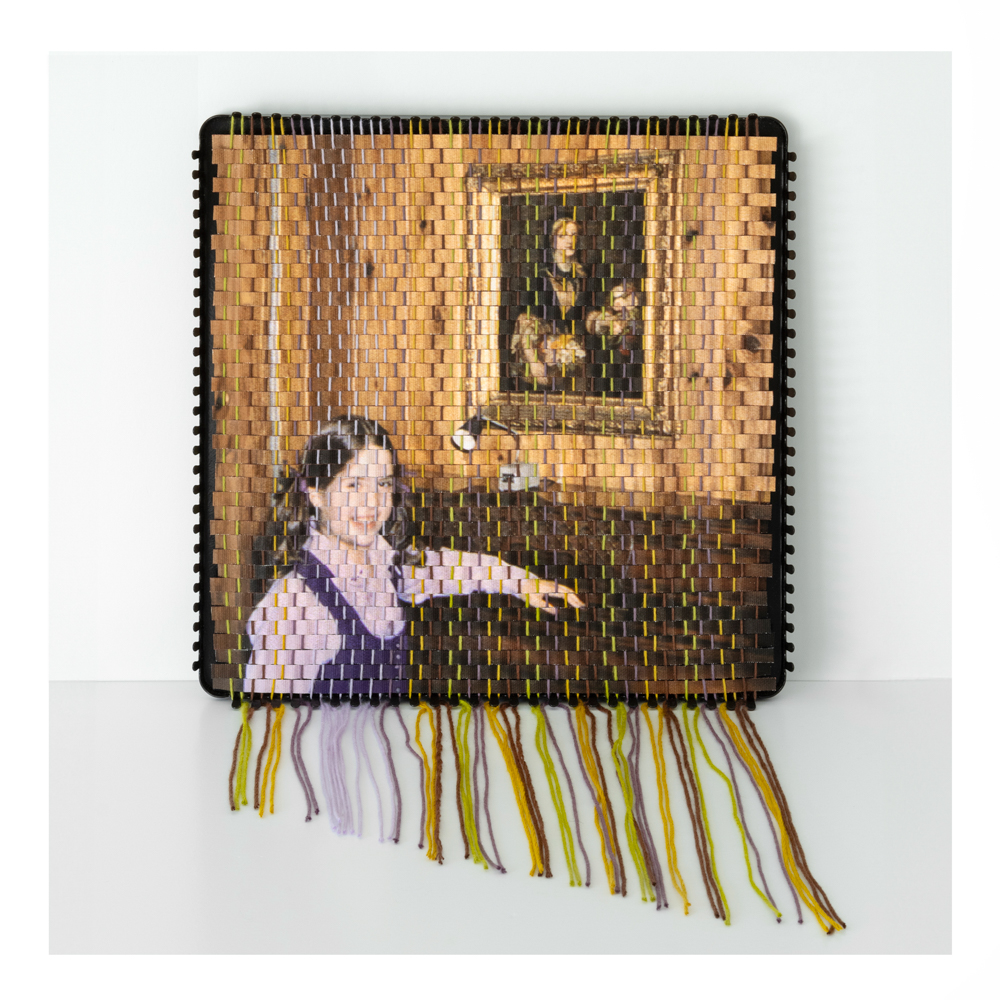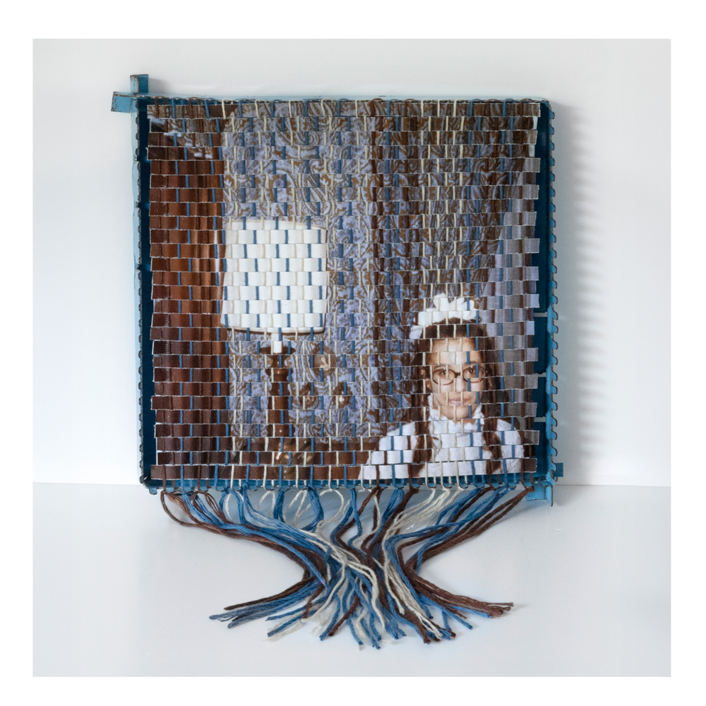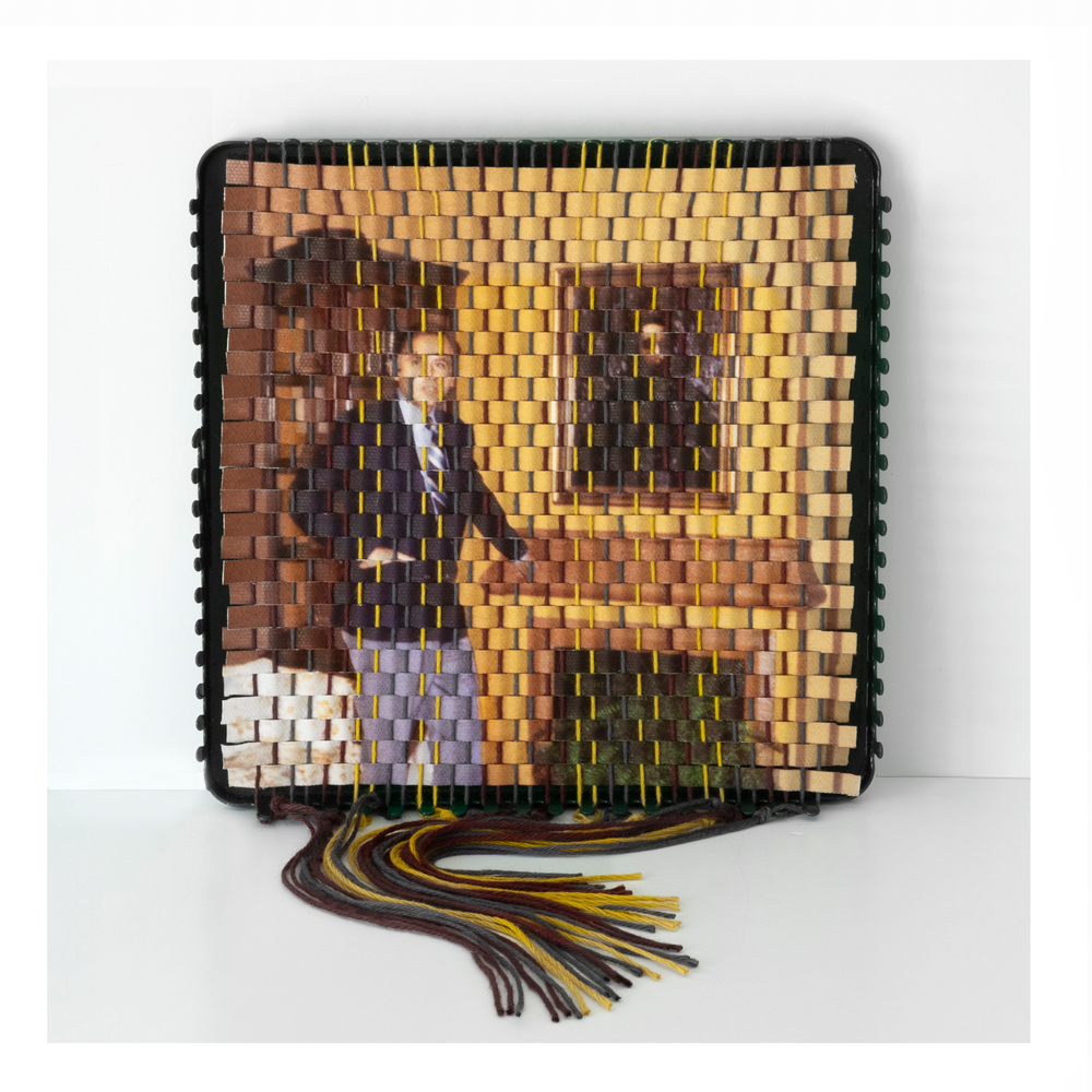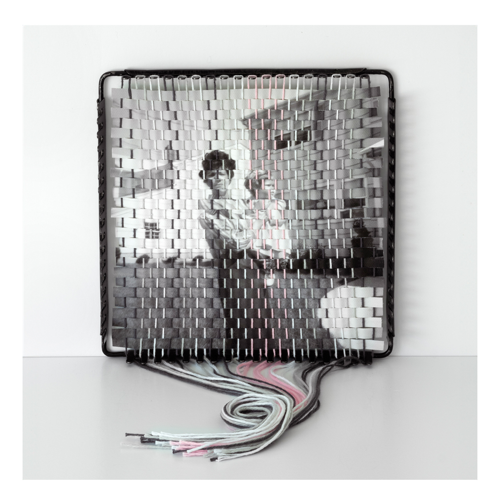 Using her archive of family snapshots, Connolly reprints the photographs digitally on canvas and slices them into strips. Warping the metal loom with colored thread, she then weaves the photographs back together. The finished piece includes both loom and woven image forming a 3-dimensional photo object. In this way, a personal history is both remembered and reconstructed-visibly imperfect and ephemeral.