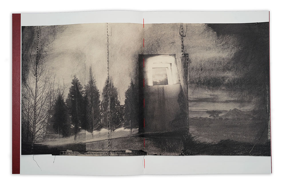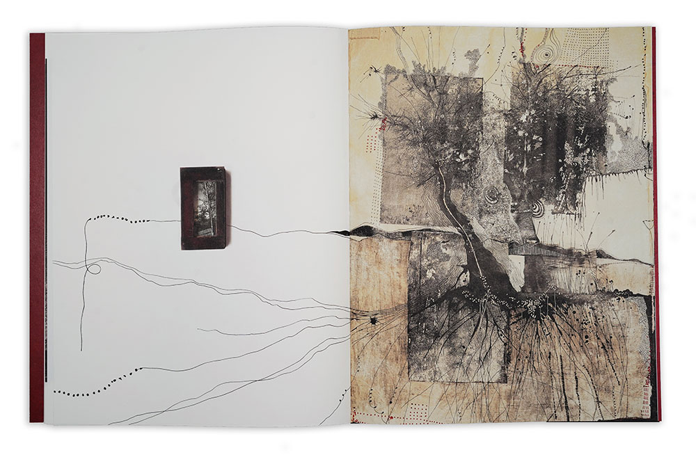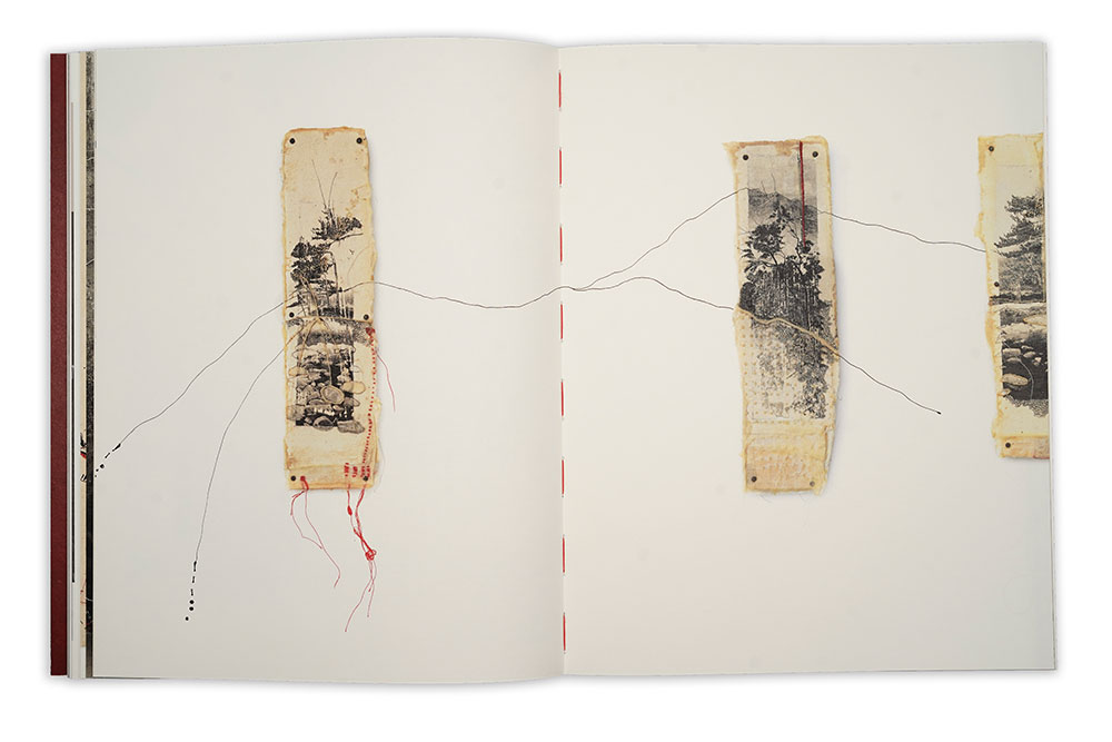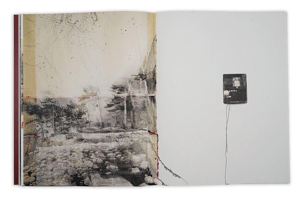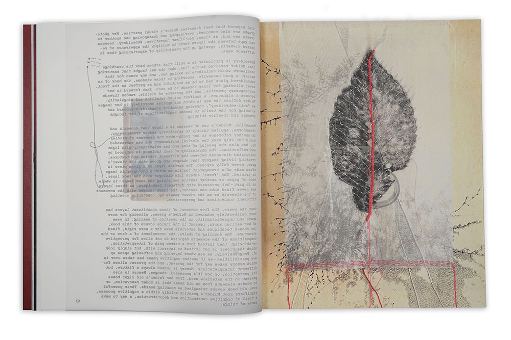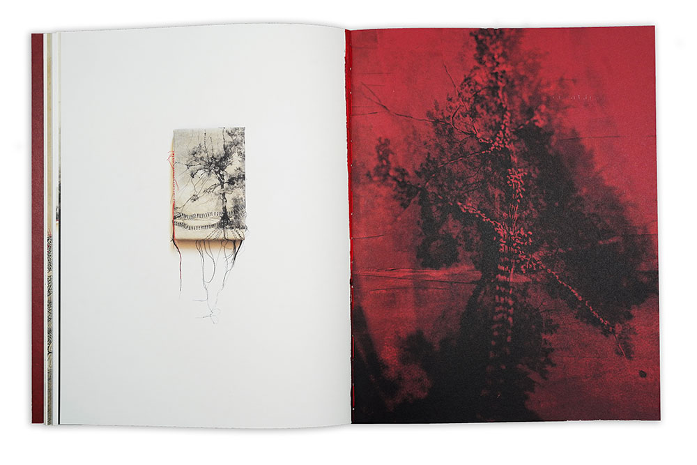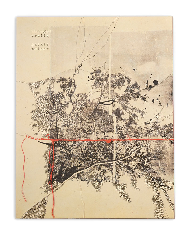 Jackie Mulder’s first book Thought Trails, unfolds like a path, winding through textiles, beeswax, and embroidery that transgress a constructed image. The pages invite the reader to move slowly, to trace the tactile residue of memory embedded in fabric and thread. As a child, Mulder endured the constraints of a repressive religious upbringing, finding solace and freedom in drawing. Each composition in this book invites the viewer to wander and find comfort within an imagined terrain that feels both intimate and universal. The recurring use of thread mirrors the way memory moves, never fully linear, yet always searching for coherence. This thread weaves through the imagery, both navigating and unifying these landscapes, functioning as a guide through their dreamlike atmosphere.