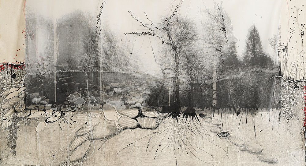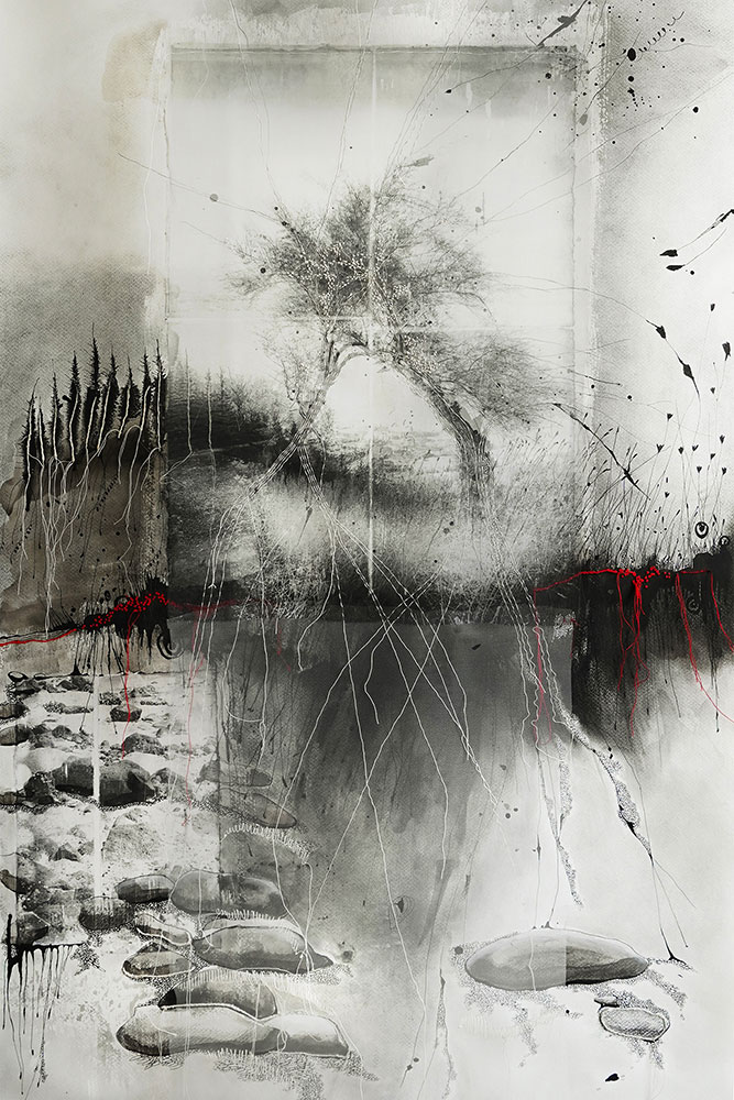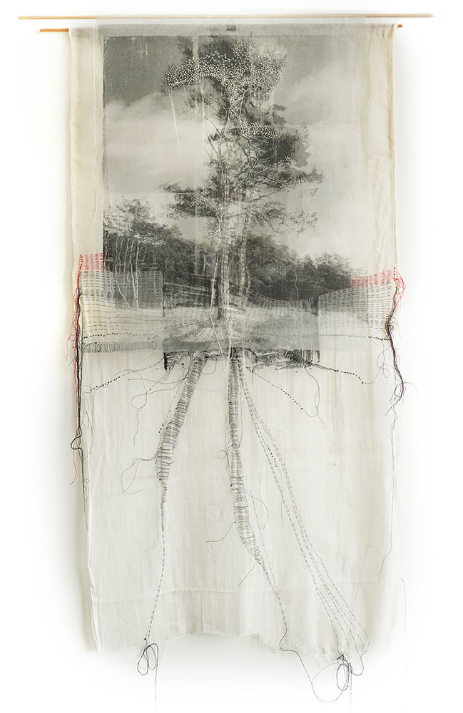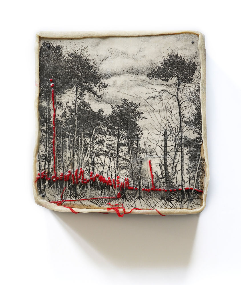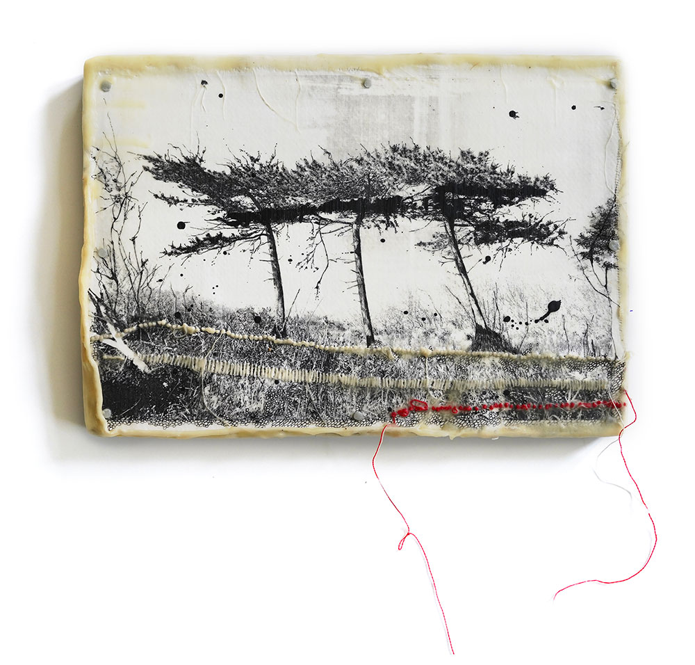 My artist practice intertwines photography with textile, embroidery and drawing to create multilayered, tactile images and tableaux. My visual universe stems largely from my youth, when I started drawing as a means to cope with a repressive religious household. Over the years, I have crafted a unique working method allowing myself to create complex, stratified artworks—where photography provides the fertile ground from which a new, layered reality appears. Photographic images are stitched together, printed in transparent textiles, altered and deconstructed, then re-constructed and layered with beeswax, embroidery and drawing.