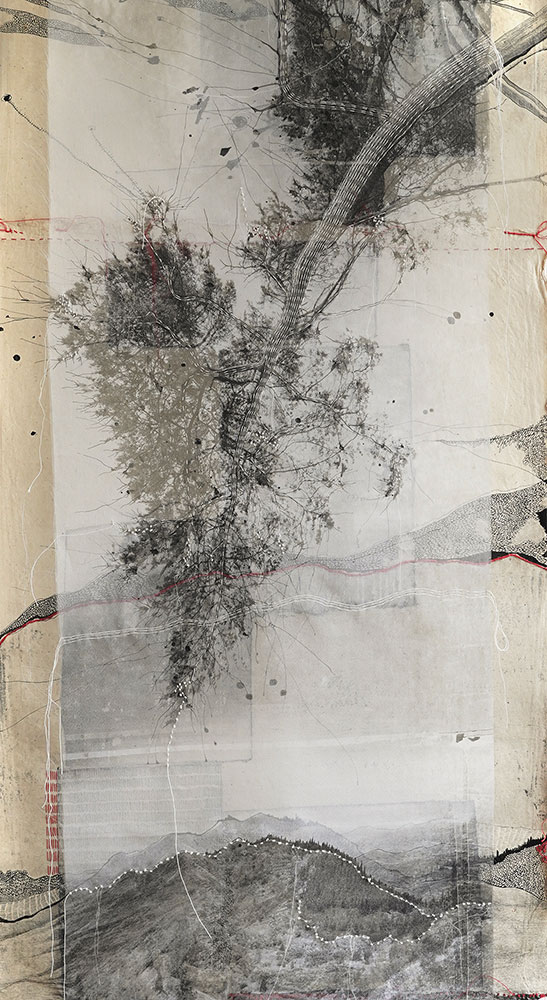 As memory functions to both reveal and hide, these images move along with the viewer, changing depending what angle experiences them. The interplay of layers and textures creates a dynamic experience, suggesting that perception itself is unstable, contingent, and deeply emotional. Mulder deliberately shapes the space between each layer of fabric and composition to emphasize a constructed reality. These images are a glimpse into the depths of memory, of contemplation and the long road to healing.