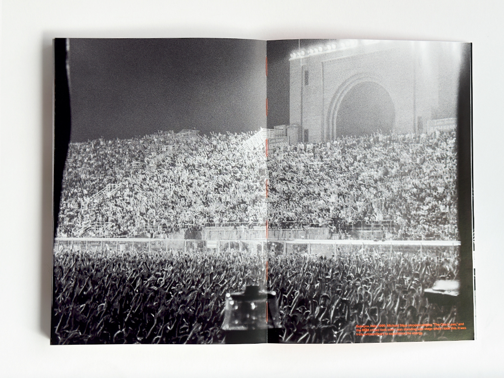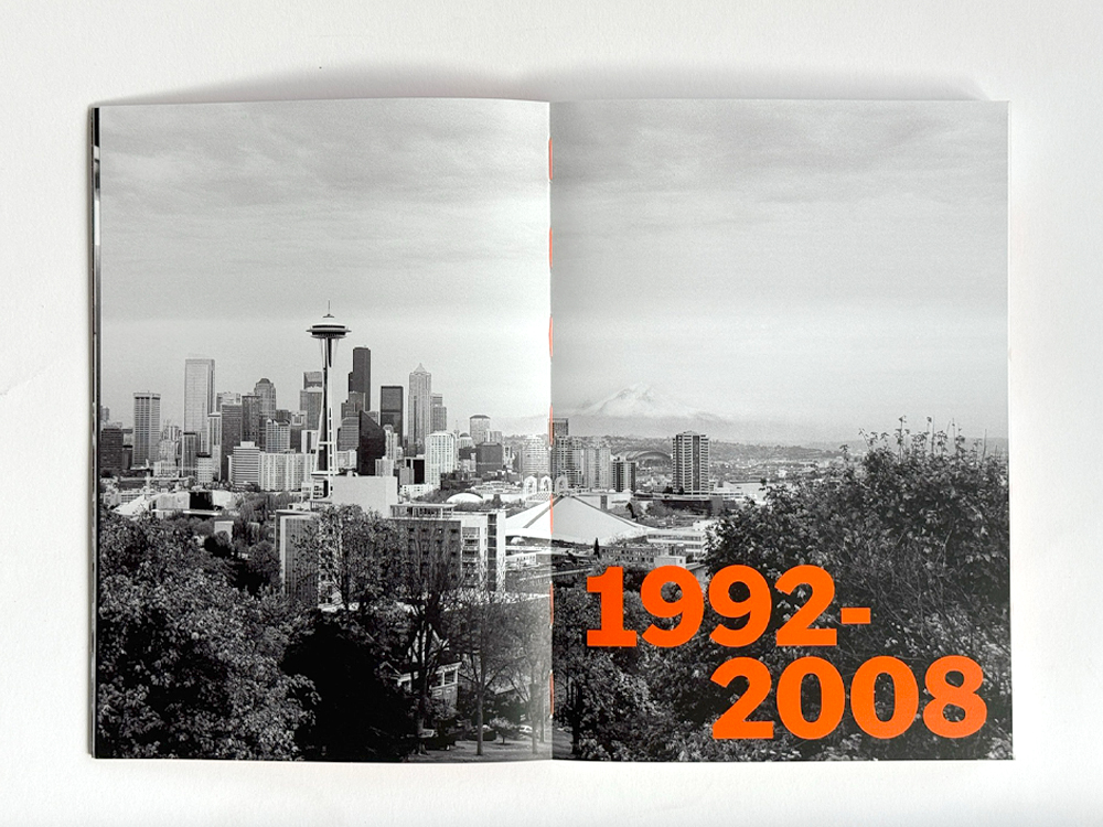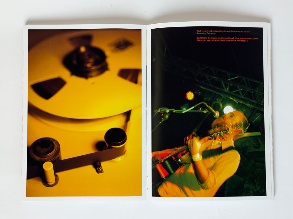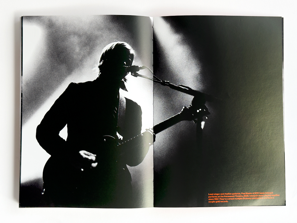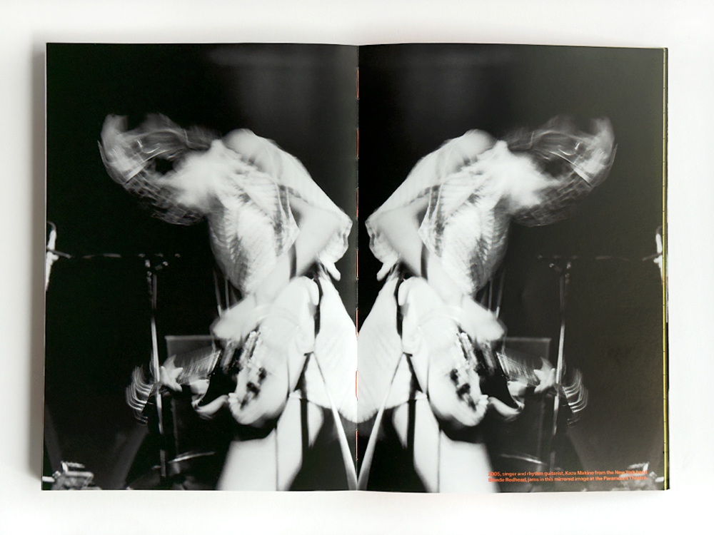 I wanted the book to be beautiful, but also rebellious. Once I had finally narrowed down the images, I started to lay them out and brought in Caleb at Luminosity Lab to help me organize and keep me on track. I have a flow I feel and follow when I move from one image to another, from one page to another, related to color, shape, or music history. It would have been hard for anyone else to place or choose the pictures. This book is part memoir, along with a history of the Seattle music scene. Some bands are relevant to the scene, while others are relevant to my photographic processes. My most significant rule was to break the rules and always follow my instinct. Caleb was a fantastic teammate and friend during this process. I had a lot of ideas in my head, such as an open spine so the book could lie flat, which led Caleb to suggest the orange thread and later text. I didn’t want a wrapped cover; having the board show felt more raw, and over time, I want it to get a bit beat up on the edges. I also saw the cover as a silkscreened music poster. Caleb came in and finished the cover design as I was getting burnt out. My other must-have was to include my story in the book. I wrote a lot to figure out what I wanted to say and brought in my editor and writer friend, Sara “Machine” Morris. I’m all over the place when I write, so she brought it all together while staying true to my voice.