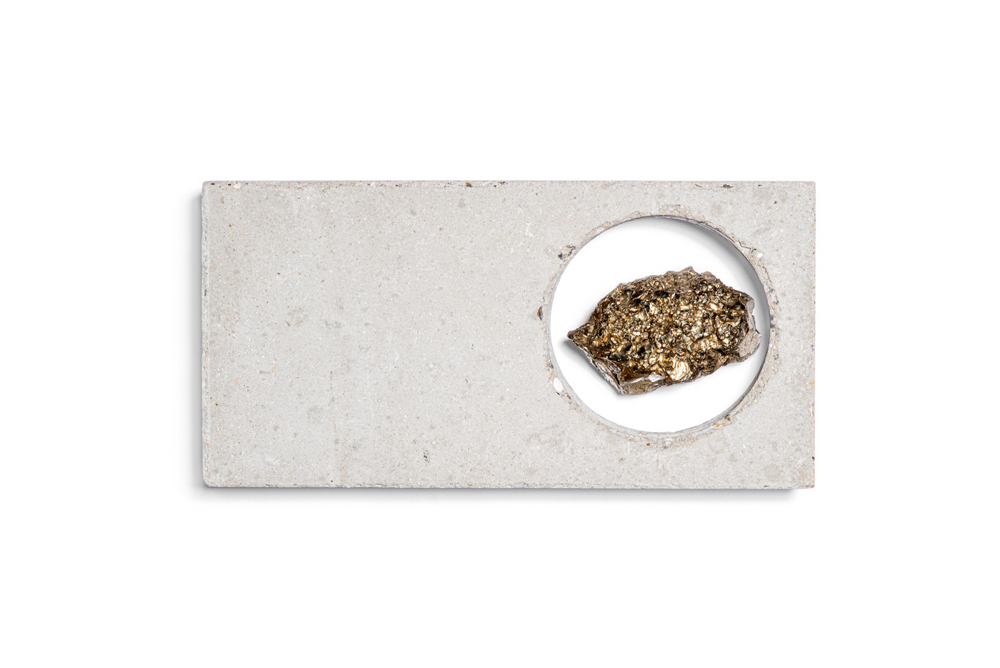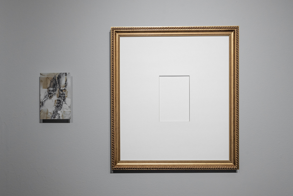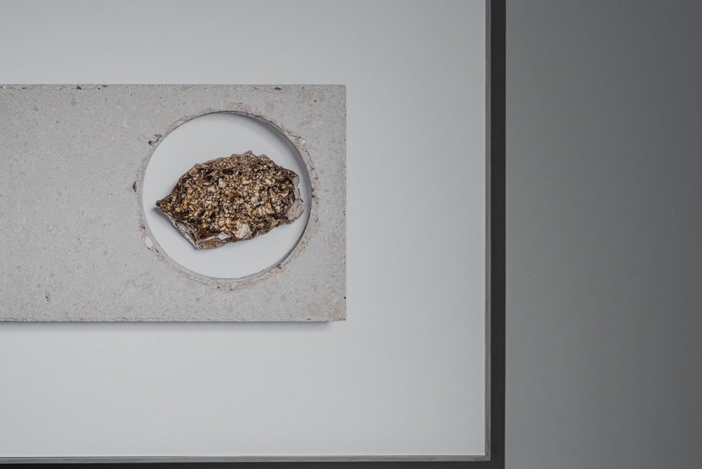 ©Salua Ares, Alguma família II (A family II), 2021 C-print with a chemical reaction from cement poured over it and a gold frame with passe-partout